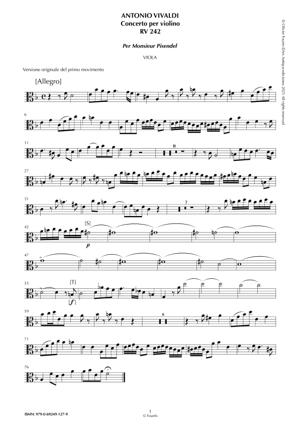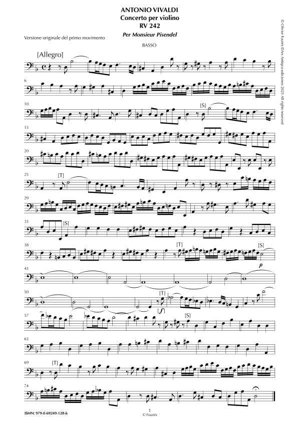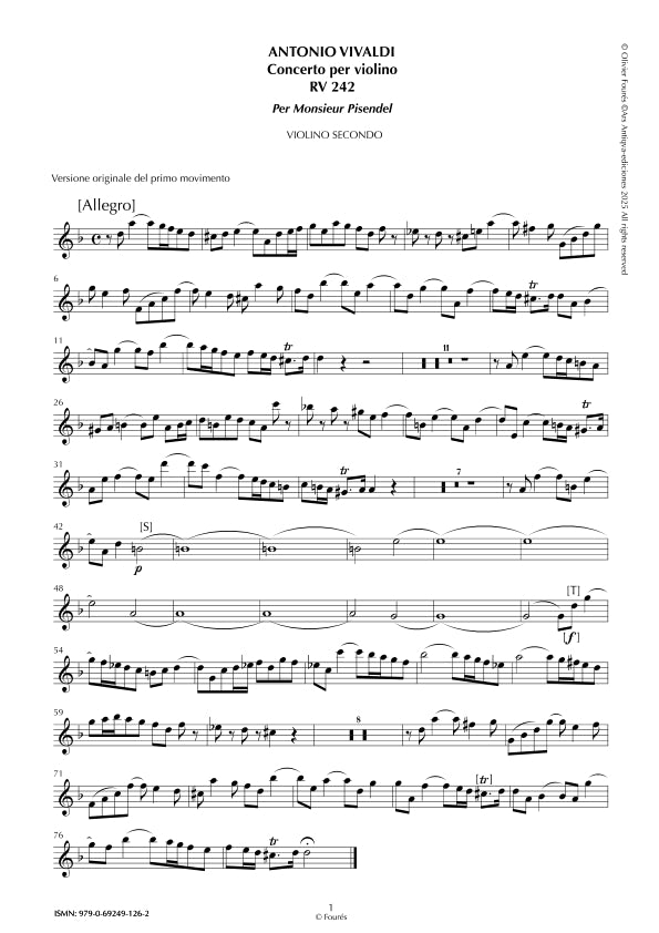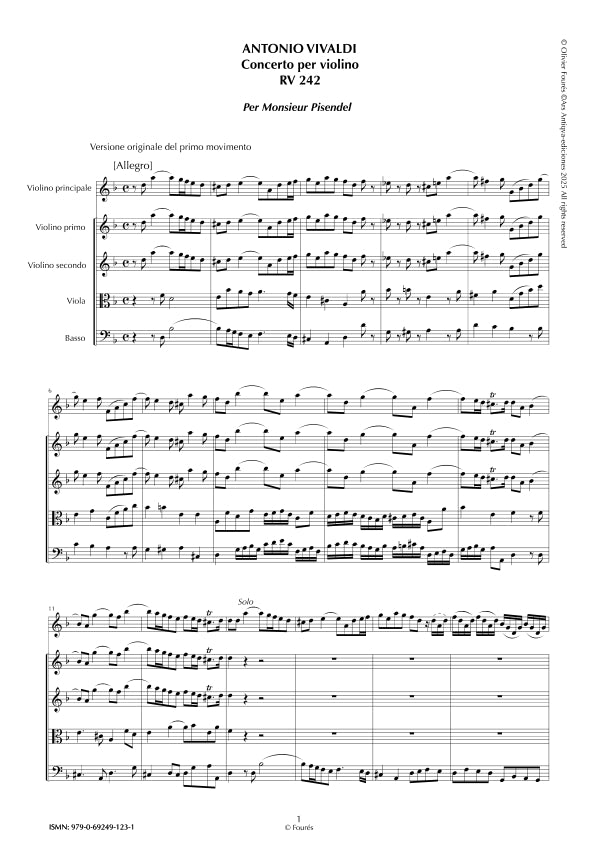 Vivaldi RV 242 Concierto para Violín, orquesta de cuerdas y Bajo continuo en re menor "per Monsieur Pisendel" de la colección "Il cimento dell´armonia e dell invenzione" op.8/7